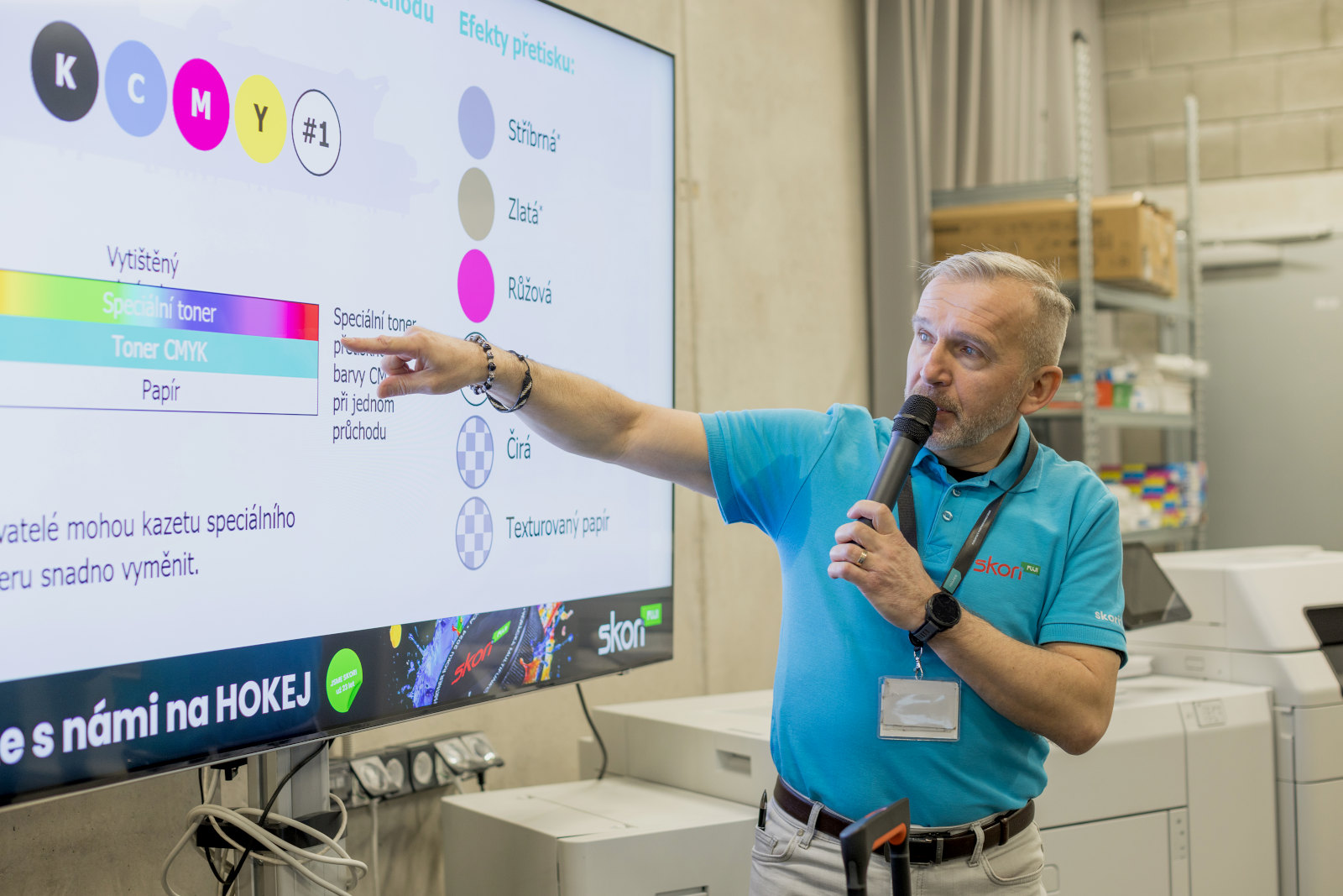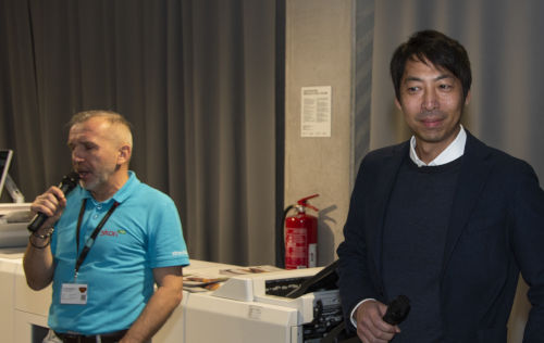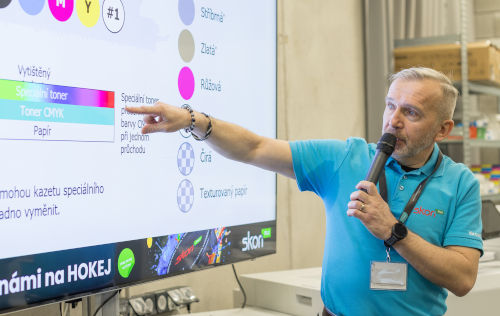 Během obou dnů jsme poprvé v ČR představili tisk zlatým tonerem v jediném průchodu, což byl nosný prvek celé prezentace. Měli jsme na místě hned dva stroje SC285S a k nim i další volitelné barvy = bílou, stříbrnou, růžovou a čirý toner. Vysvětlili jsme, jak správně a efektivně pracovat s přídavnými barvami i v rámci marketingu a dosáhnout zvýšení ziskovosti tiskových provozů. Všichni viděli v praxi, že i Výměna speciálních barev není nic složitého.