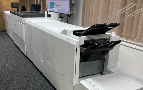 Dále jste mohli na našem stánku vidět černobílý produkční stroj Revoria Press E1. Ten jsme vystavovali v nejčastější konfiguraci, která zahrnuje unikátní podtlakové nakladače papírů, finišing vč. vazby V1 doplněný o Square Back Fold Trimmer. Tato konfigurace umožňuje vysoce efektivní výrobu například návodů k obsluze ve výrobních linkách našich zákazníků. Velkou výhodou je takřka bezobslužný provoz, vynikající vzhled výsledných brožur a maximální efektivita s minimem prostojů. I zde se můžeme pochlubit objednávkou uzavřenou přímo na stánku s naším dlouholetým partnerem společností PLAM, s.r.o. – pánové objednali hned 2 stroje – děkujeme!