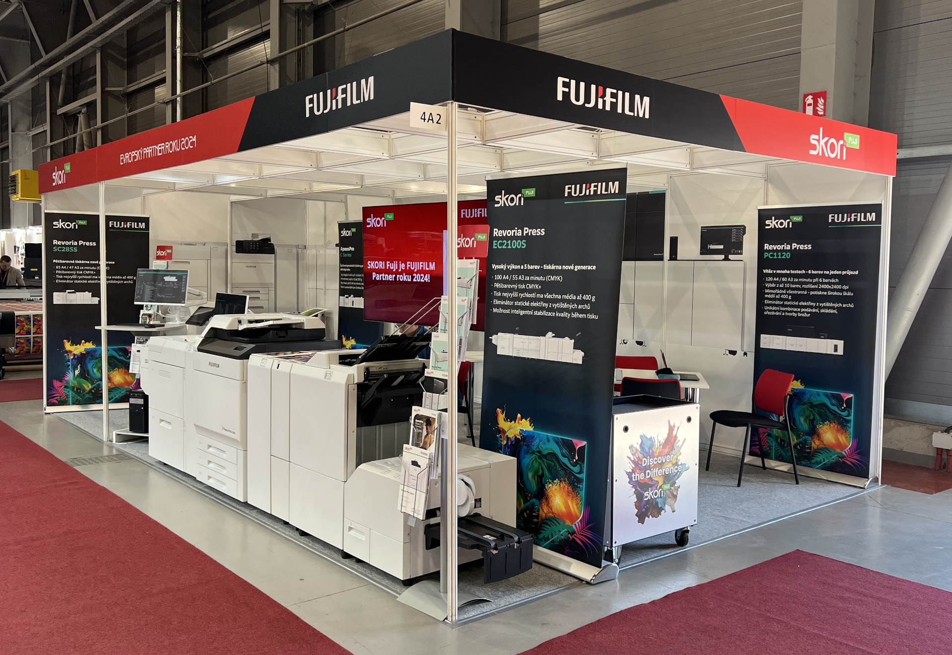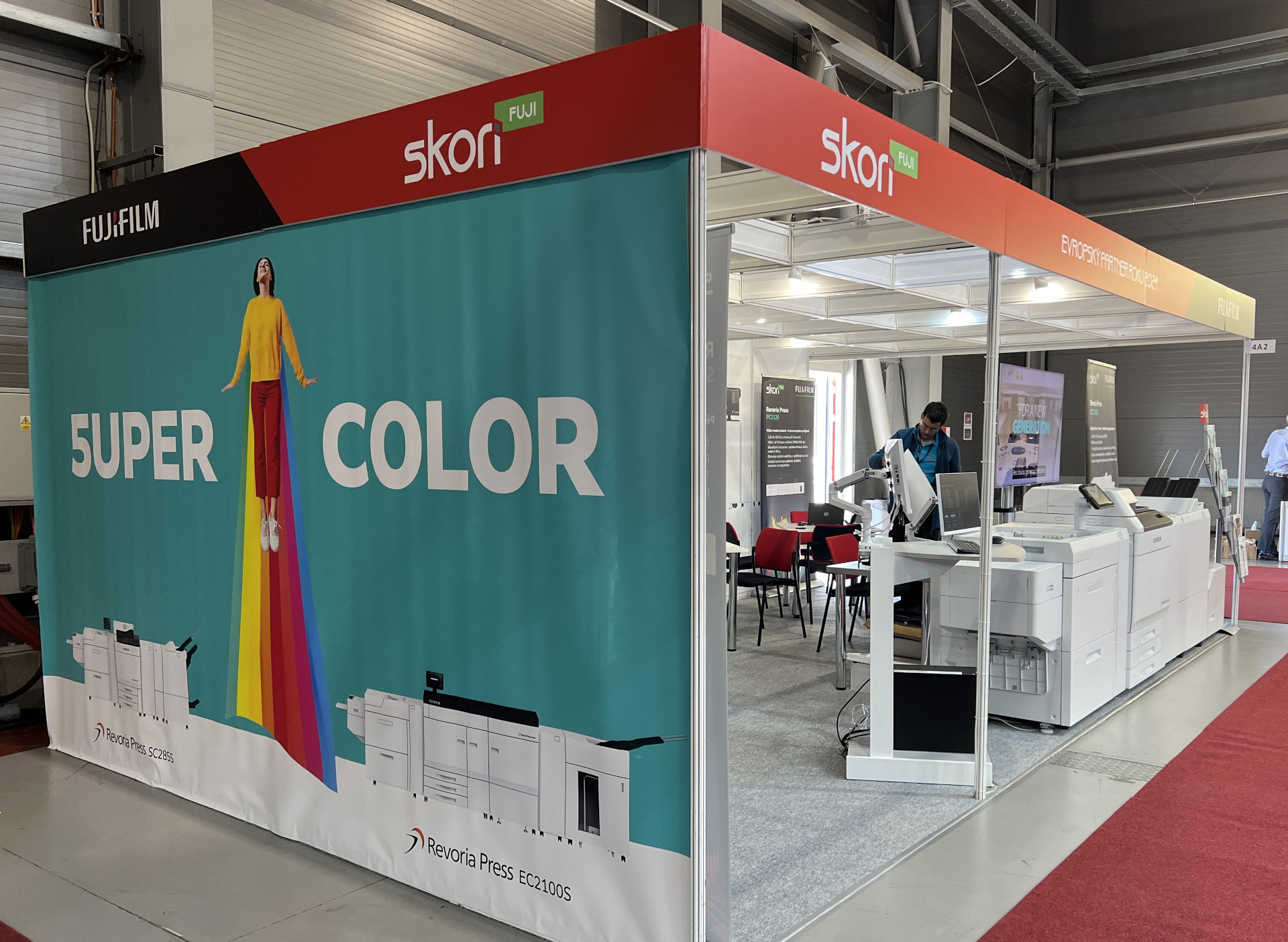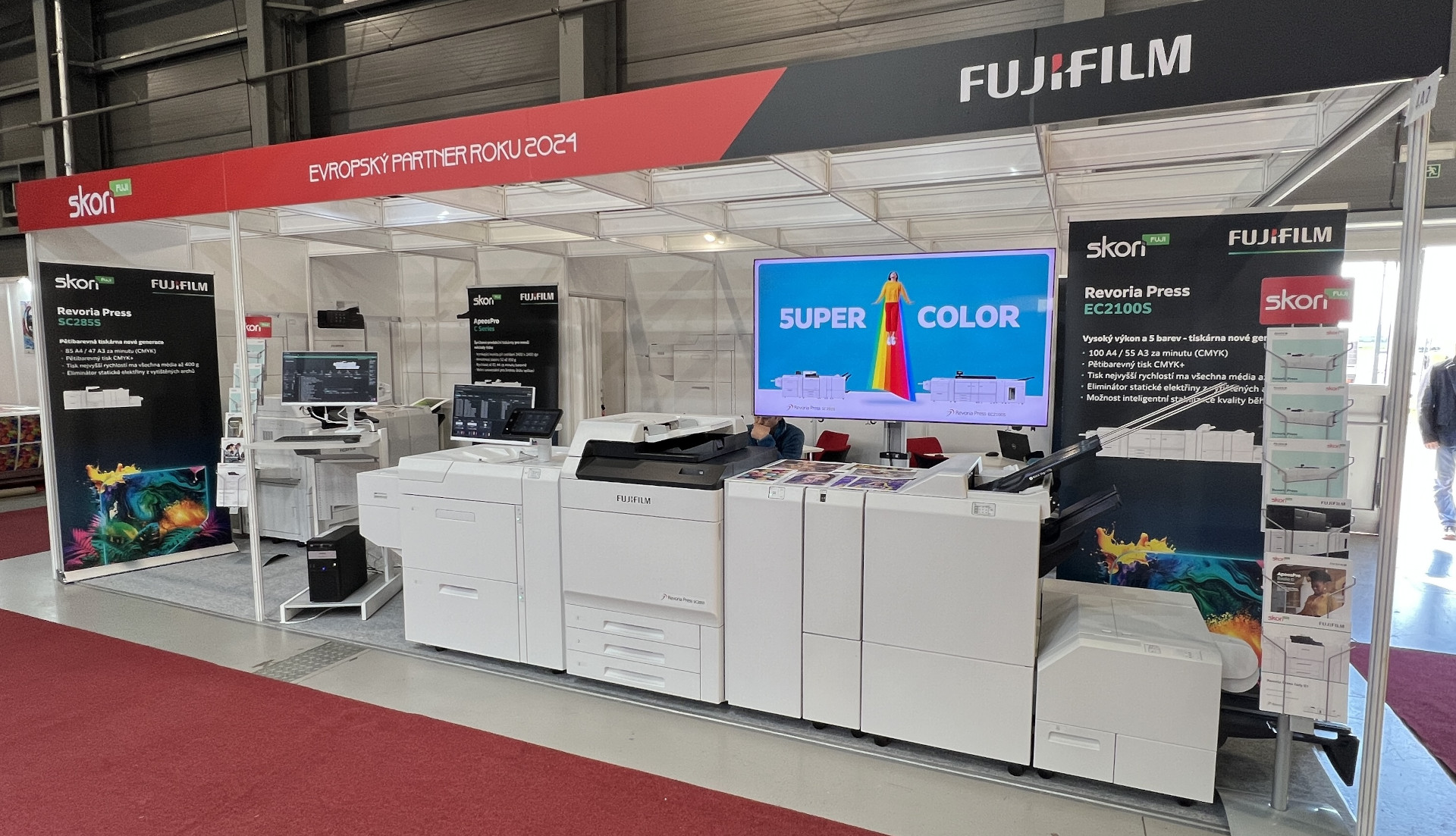 Rozsáhlá expozice společnosti Fujifilm Česká republika a v jejím sousedství náš stánek SKORI Fuji demonstrovala jak šířku záběru společnosti Fujifilm, tak naši schopnost vysoce odborně nabízet, prodávat a servisovat sofistikované tiskové systémy Fujifilm. Společnost SKORI Fuji se specializuje na produkční tonerové a inkoustové tiskové technologie. Se značkou Fujifilm navazujeme na naši dlouholetou a hlubokou znalost tiskových technologií.