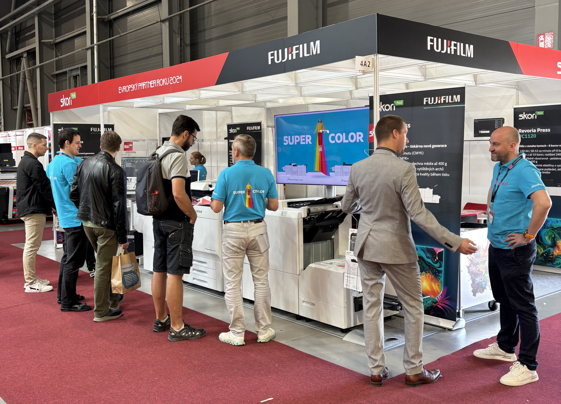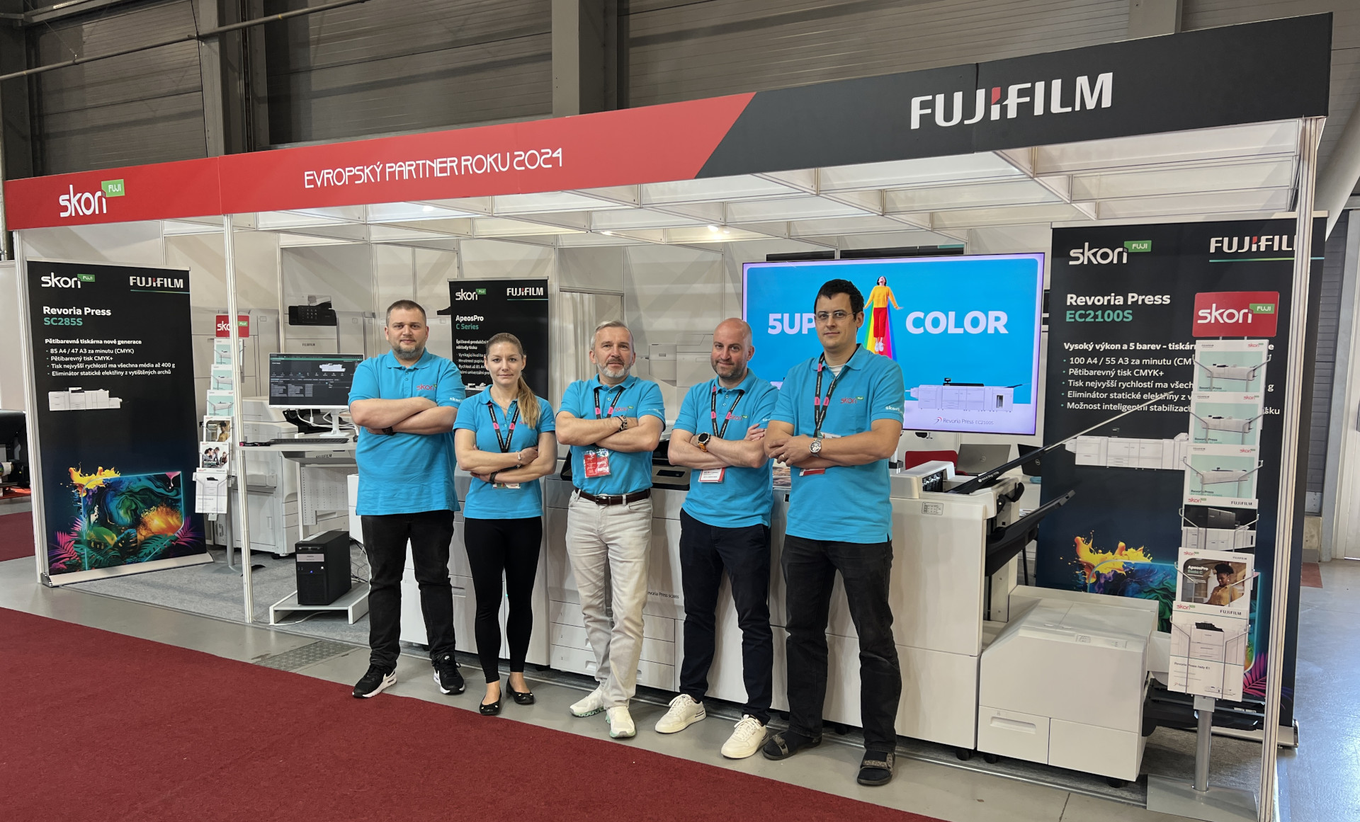 Pochlubili jsme se všem návštěvníkům titulem Evropský partner roku Fujifilm 2024, který jsme letos získali. Přivezli jsme na místo hned pět produkčních strojů a 3 z nich byly dlouhé vždy přes 6 metrů, takže opravdu velké produkční stroje. Dva z nich byly dokonce horké novinky v našem portfoliu, a to Revoria Press SC285S a Revoria Press EC2100S, které v základu umožňují tisk 5barvami!